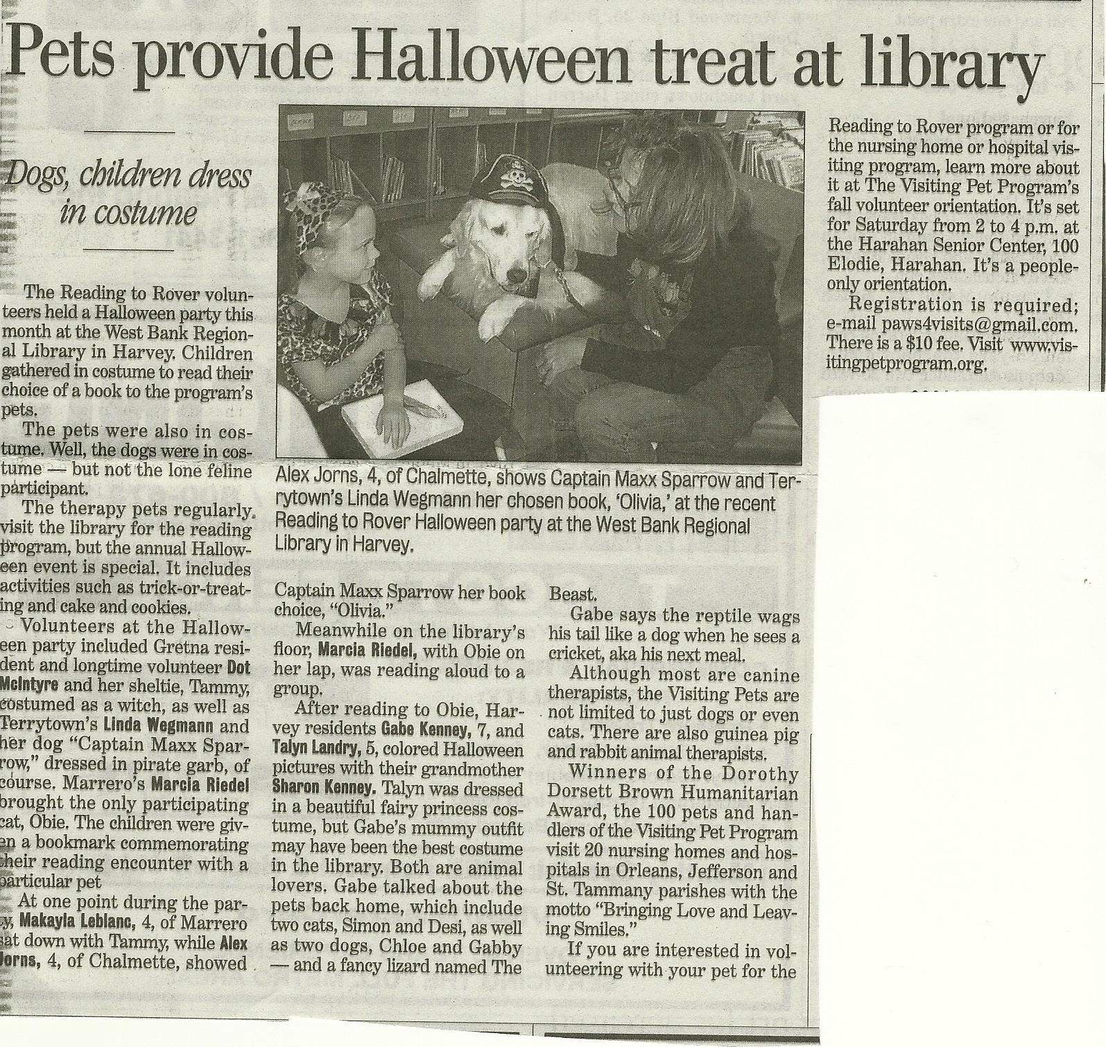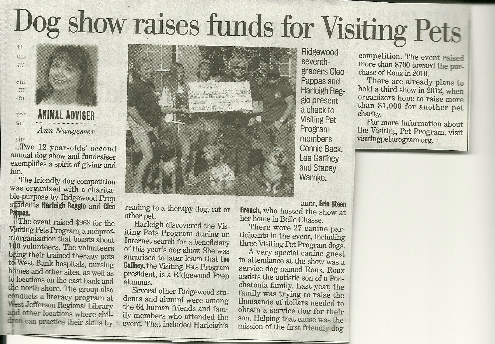 In 2007, we hit our landmark year of 20 years of service to the greater New Orleans area. Post-Katrina, our volunteer numbers are just over 100 and rebuilding. We currently serve 22 facilities, each getting a visit at least once a month; that number also continues to rebuild since the storm. In 2000, we developed our very successful literacy project, Reading To Rover.